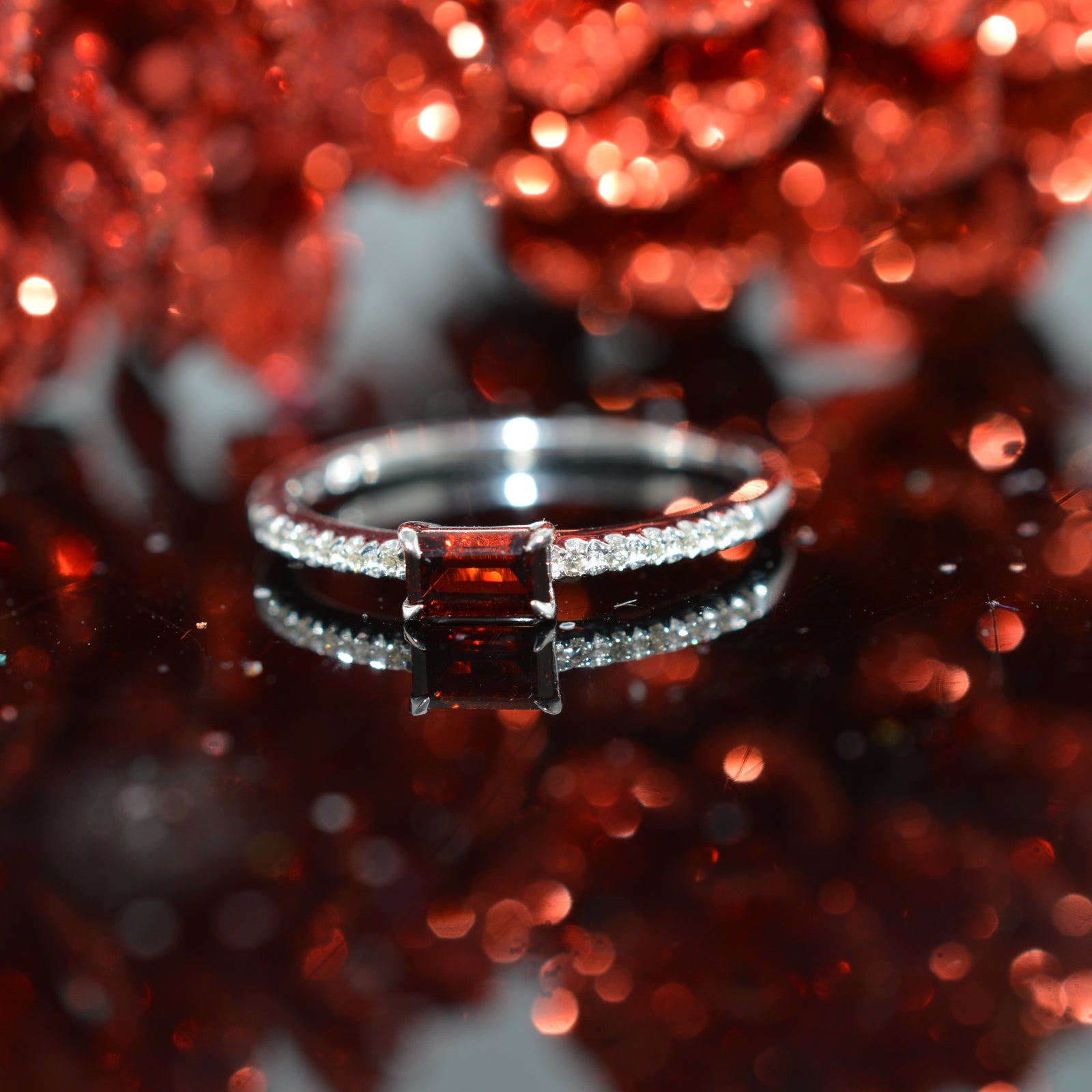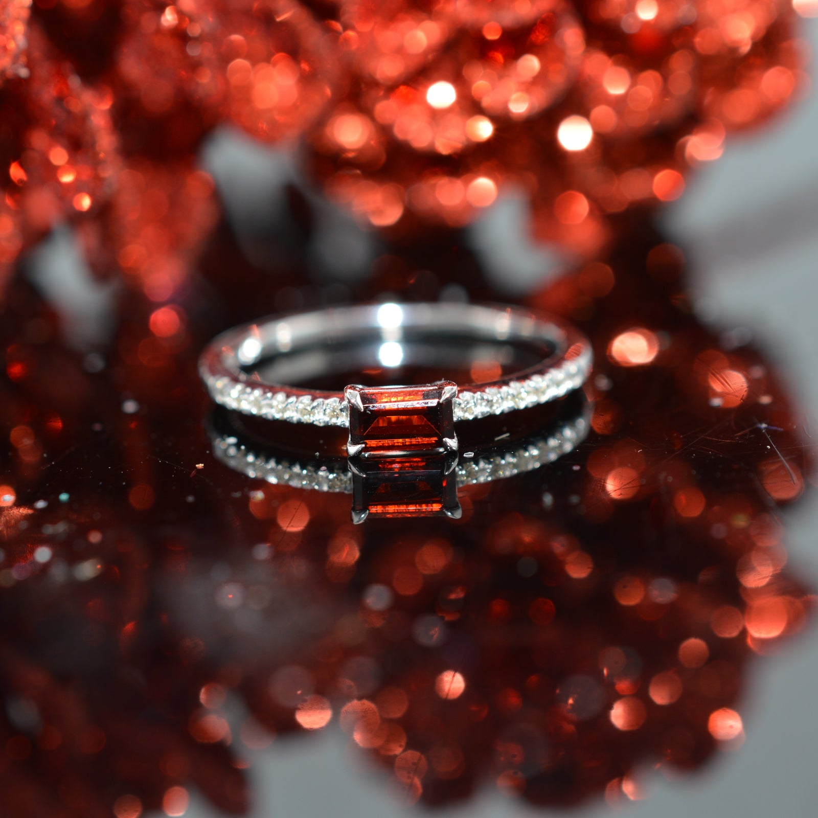 $450.00 USD10K White Gold Sideways Set Emerald-Cut Garnet And Diamond Stackable Ring