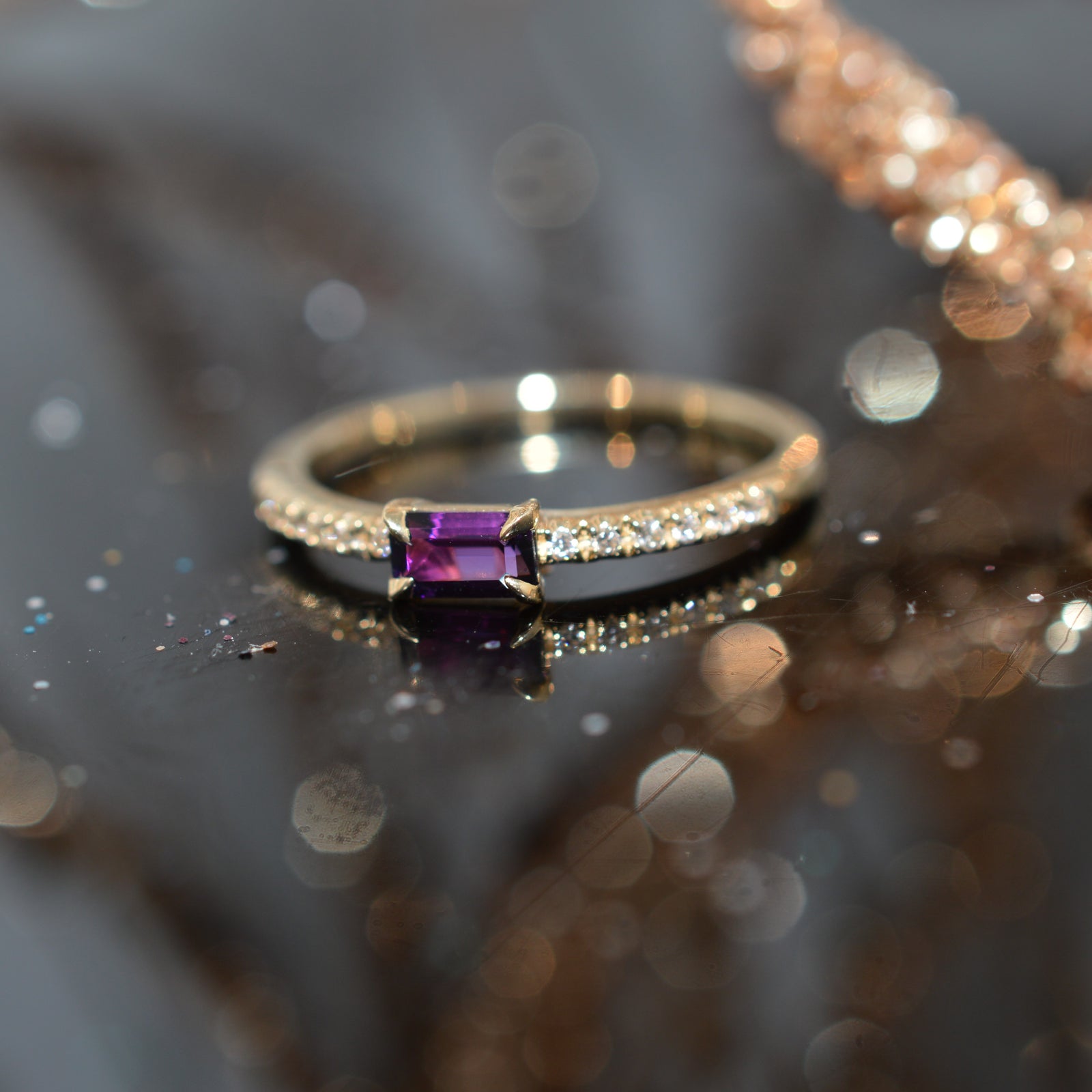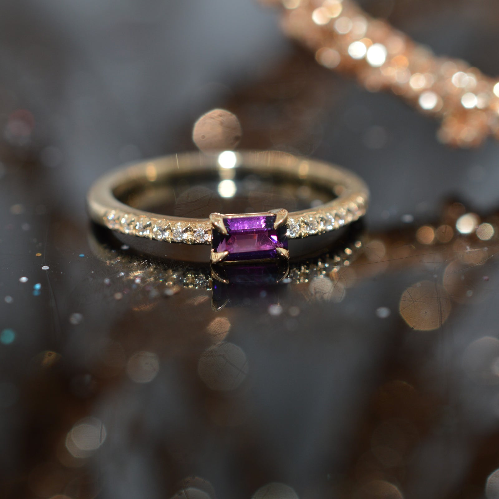 10K White Gold Sideways Set Emerald-Cut Amethyst And Diamond Stackable Ring