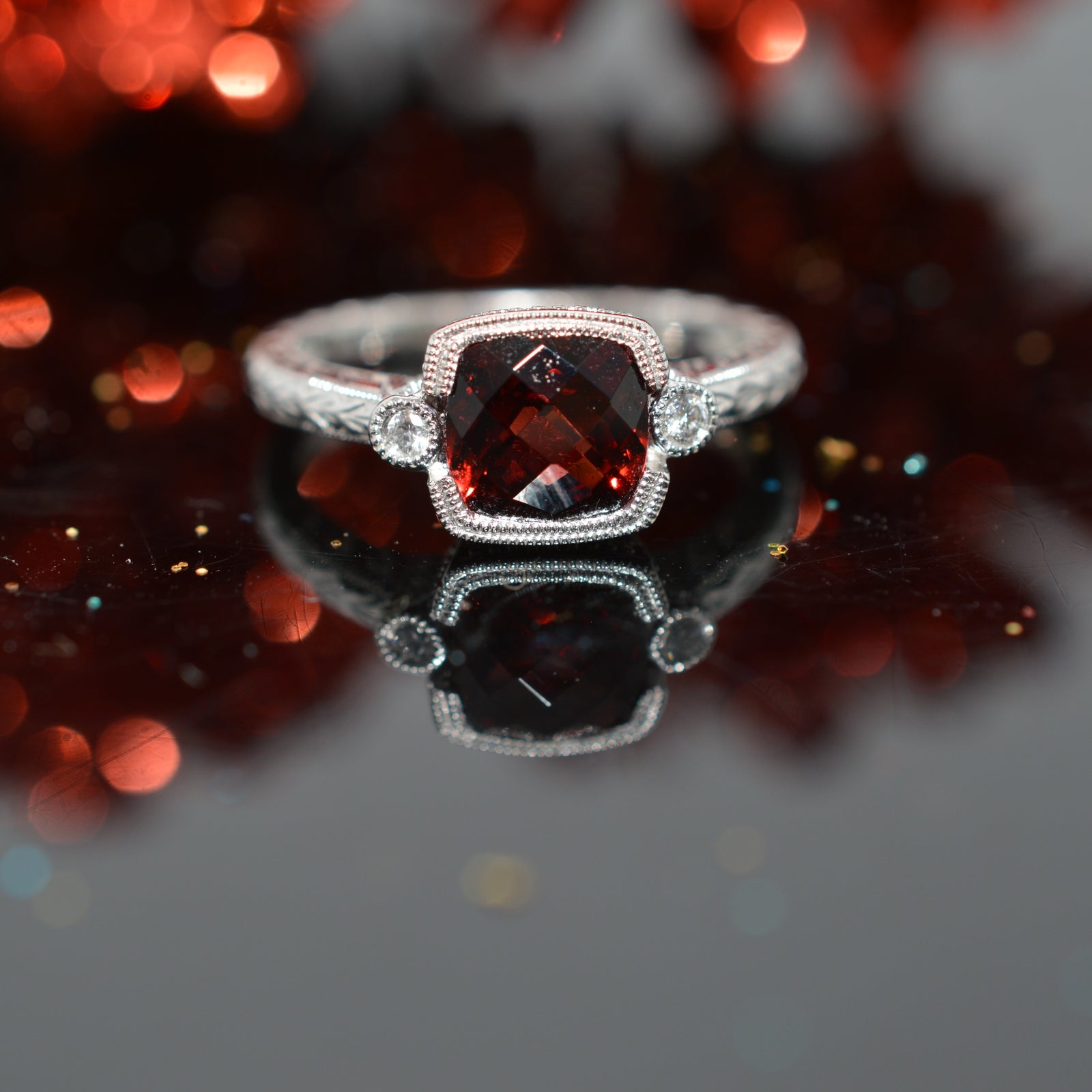 $800.00 USD14K White Gold Checkerboard Cushion Cut Red Garnet And Diamond Ring