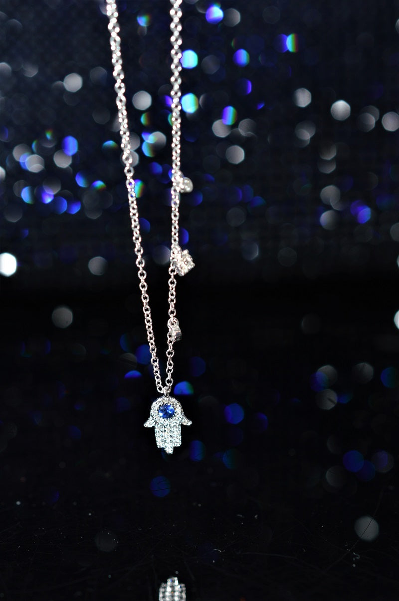 $2,500.00 USD14K White Gold Diamond and Sapphire Hand Of Fatima Necklace