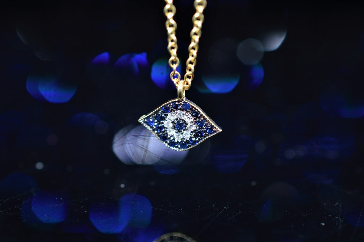 $775.00 USD14K Yellow Gold Diamond and Sapphire Evil Eye Necklace