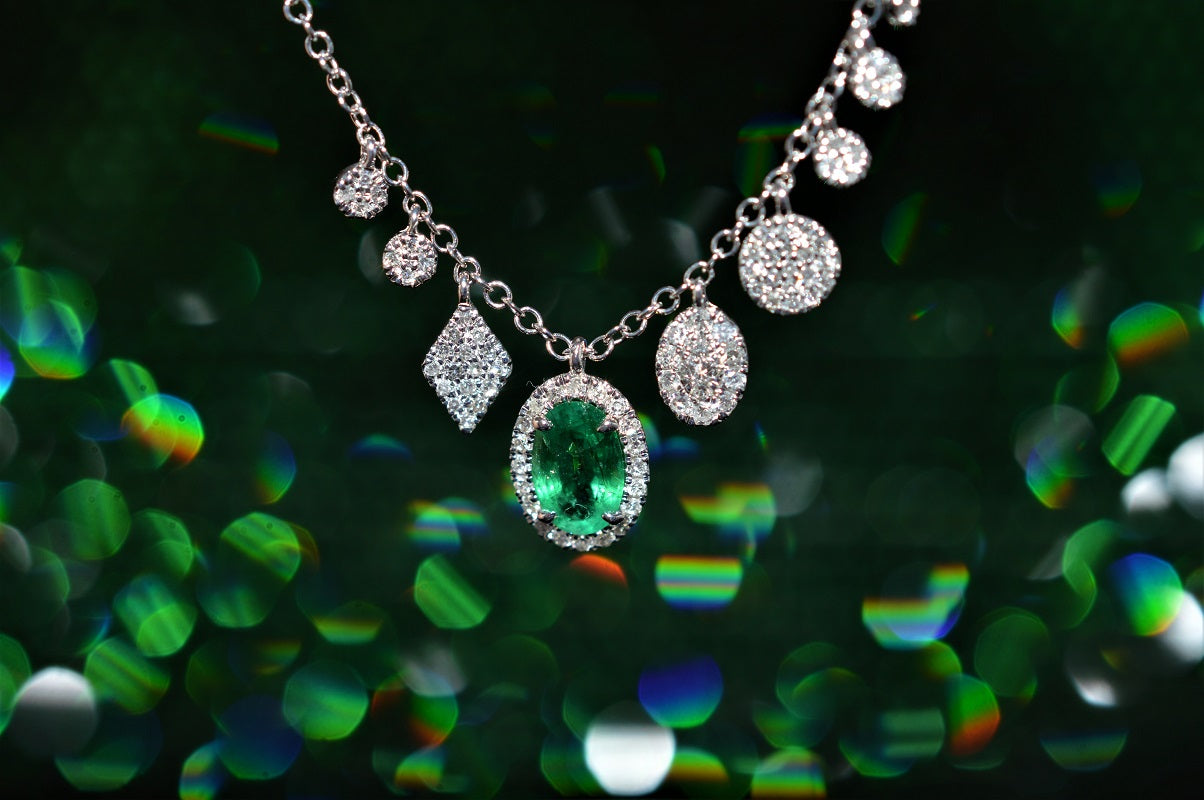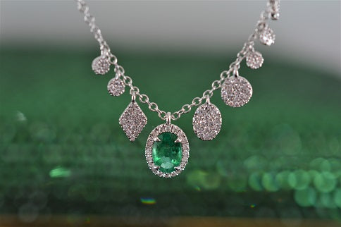 $1,200.00 USD14K White Gold Oval Emerald and Diamond Charm Necklace