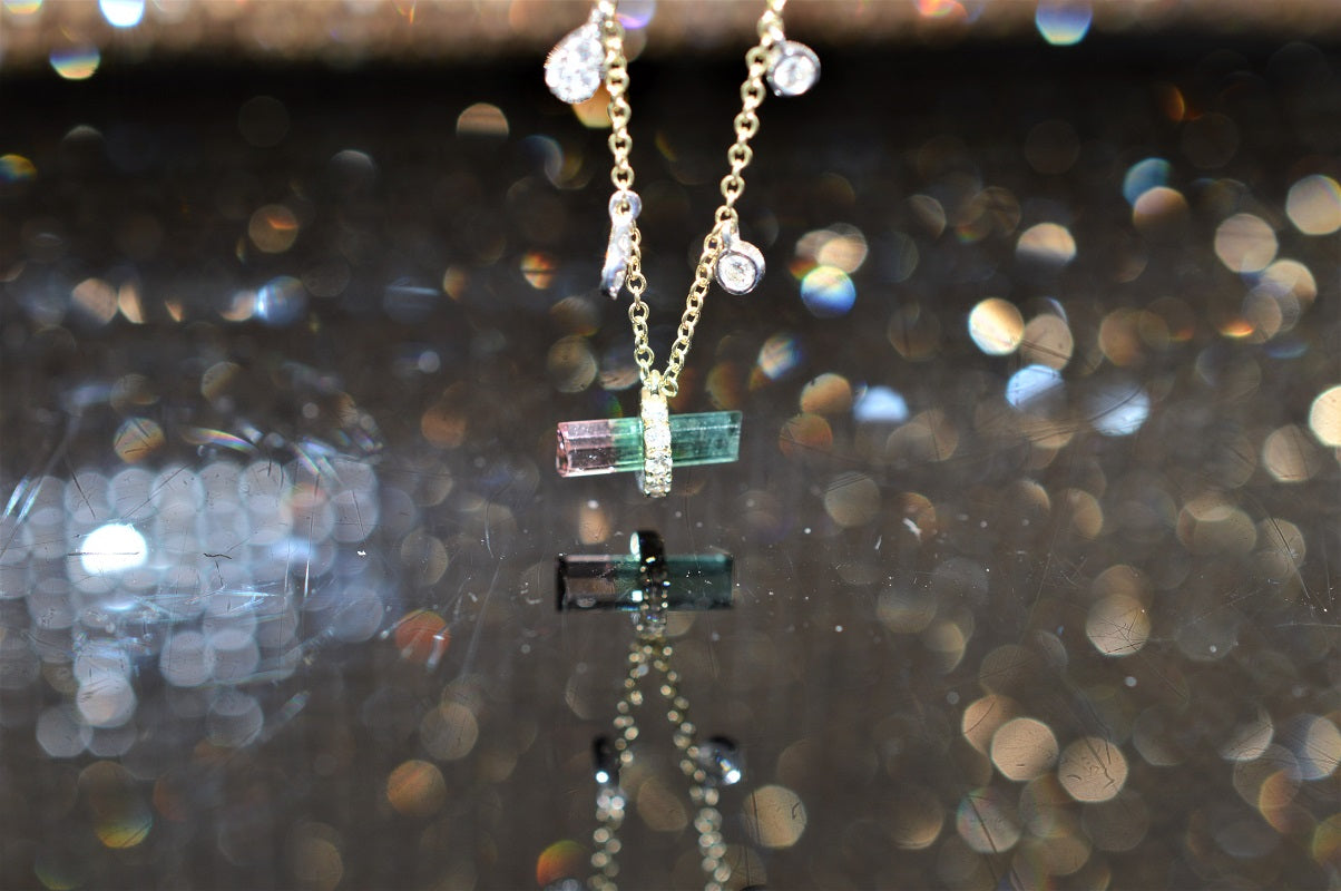 $1,300.00 USD14K Yellow Gold Watermelon Tourmaline and Diamond Necklace