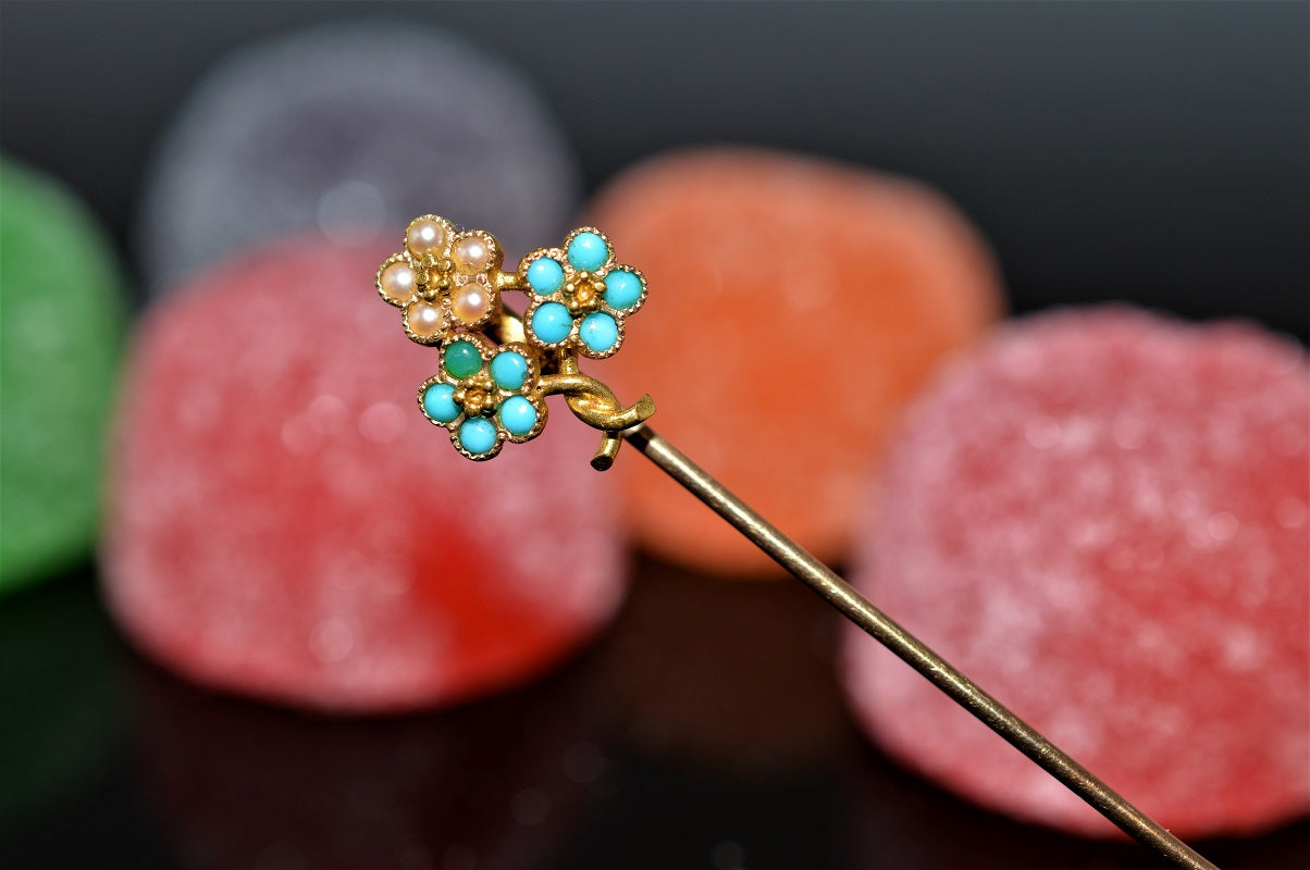 $275.00 USD18K Yellow Gold Turquoise and Pearls Flower Design Stickpin