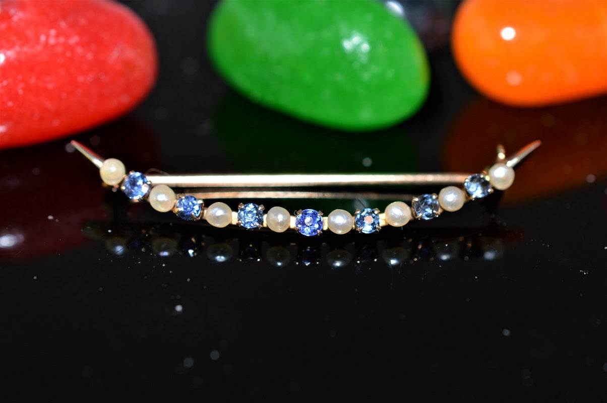 $995.00 USD10K Yellow Gold Pearl and Sapphire Crescent Brooch