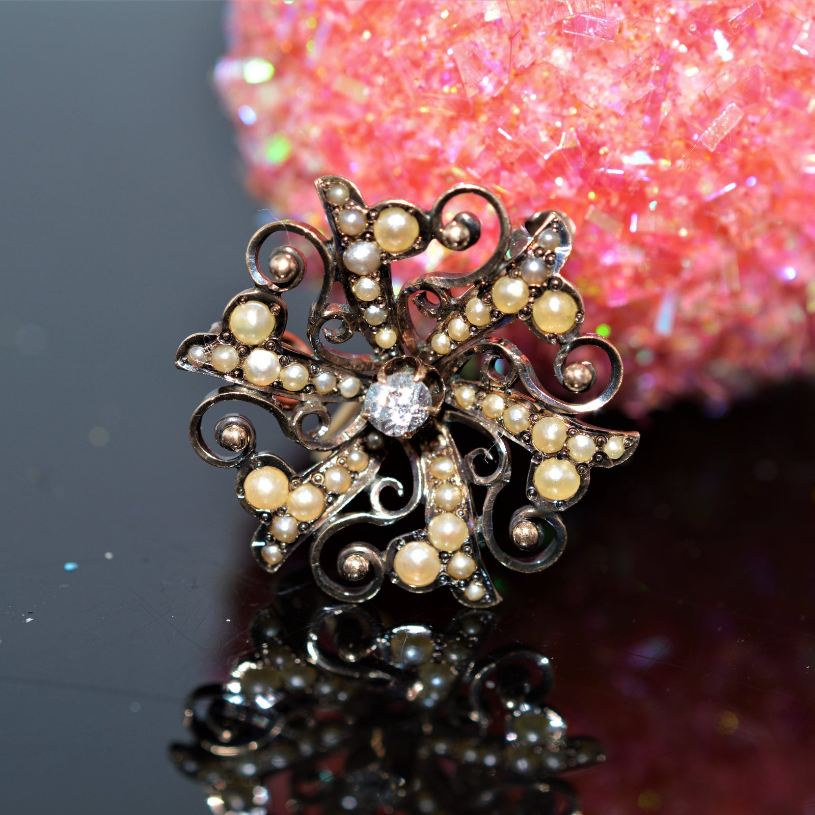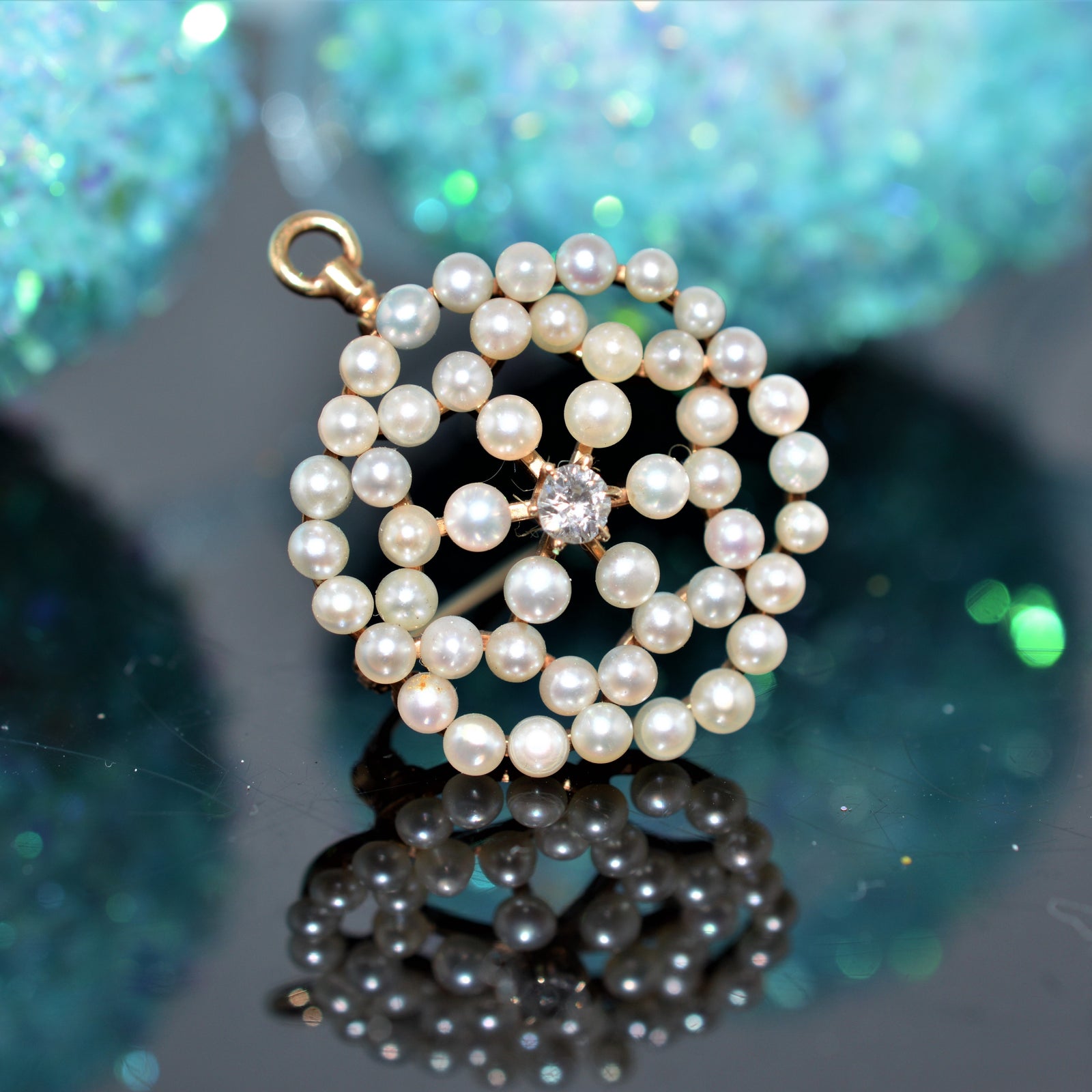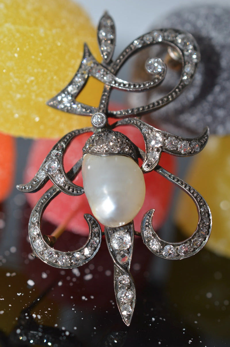 $1,250.00 USDAntique Silver Topped Gold Pearl and Diamond Brooch/Pendant