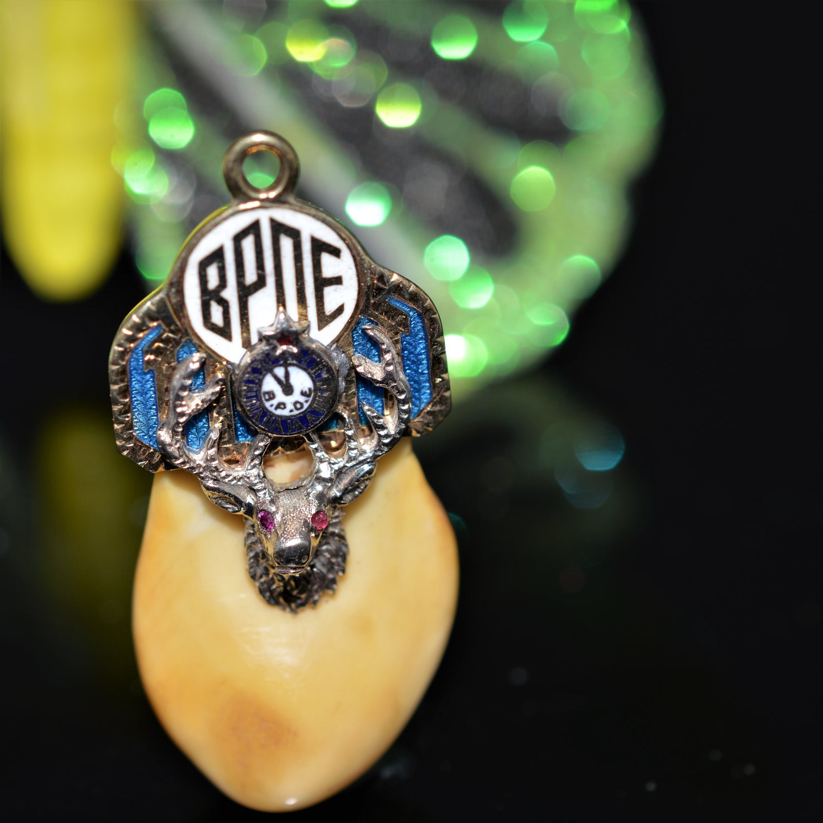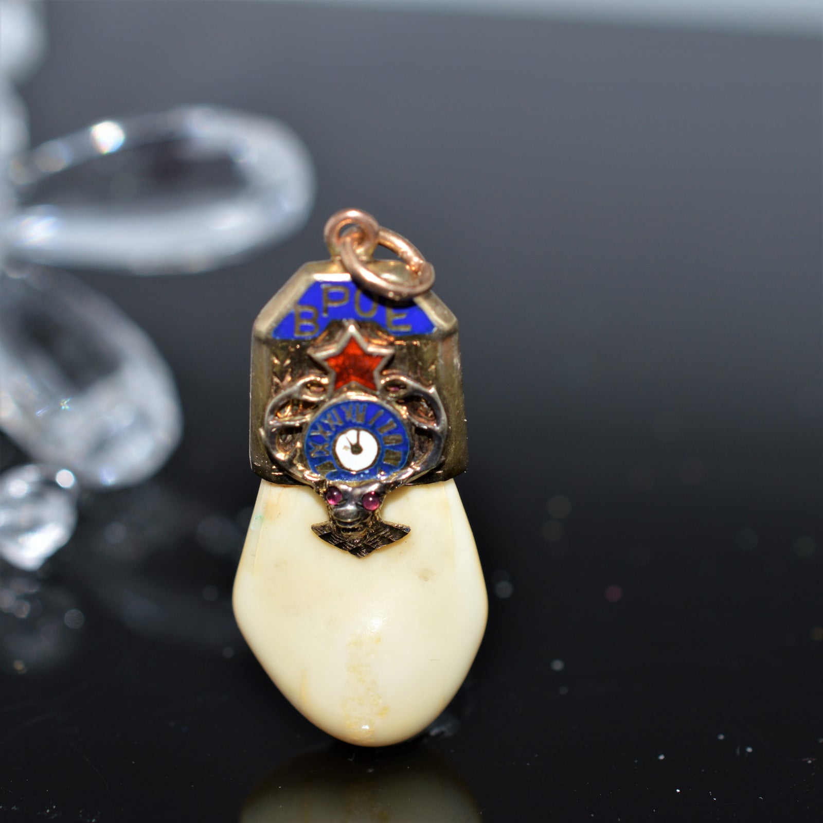 $1,650.00 USD14K Yellow Gold Enameled Elk's Tooth Pendant With Ruby Eyes