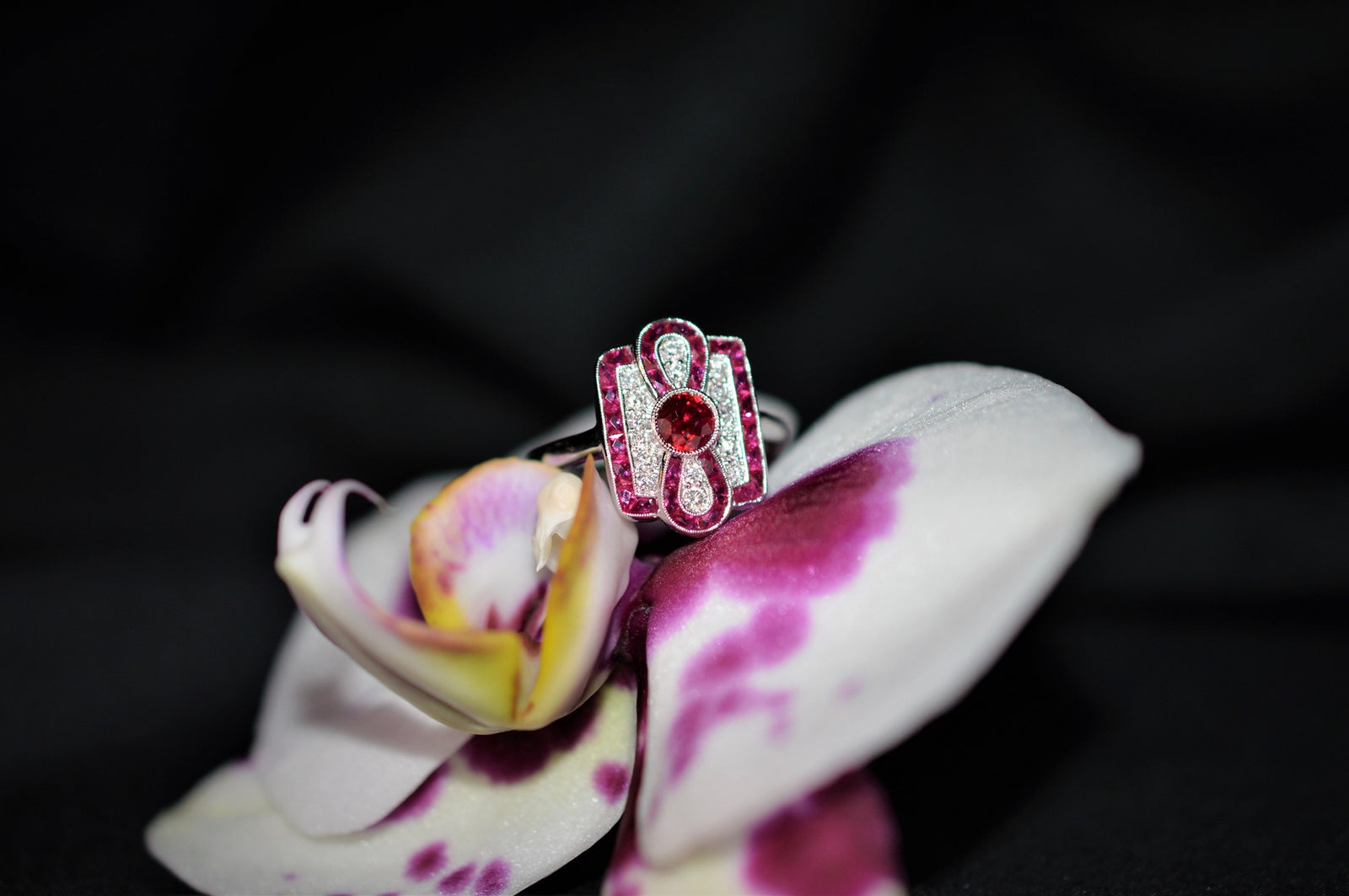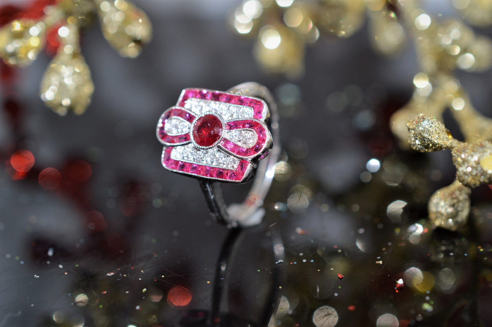 $3,950.00 USD18K Ruby and Diamond Infinity Style Art Deco Inspired Ring