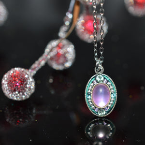 A Ladies Antique Silver Plate 16 To 18 Inch Adjustable Necklace By Firefly Featuring An Oval Soft Moonlight Pink Crystal.