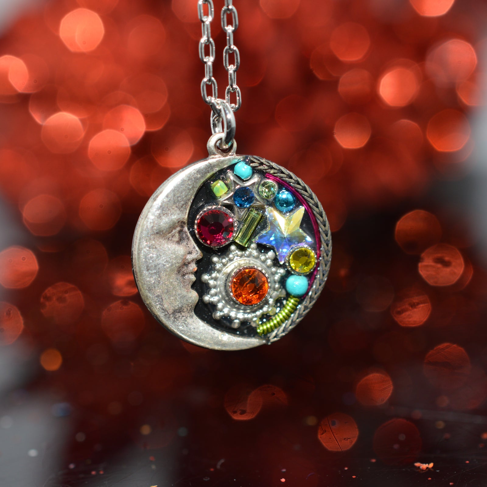 $72.00 USDAntique Silver Plated Moon & Stars Crystal Pendant by Firefly