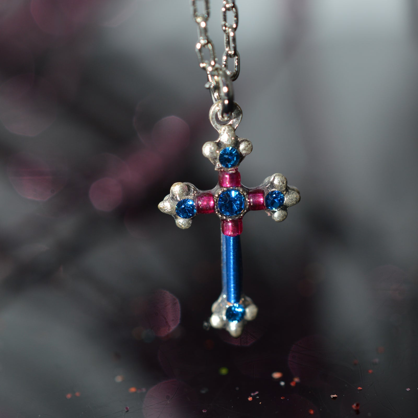 $90.00 USDAntique Silver Plated Dainty Bermuda Blue Crystal Cross Pendant by Firefly