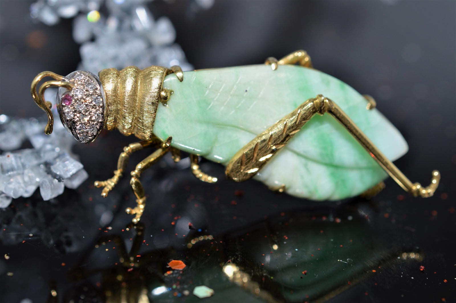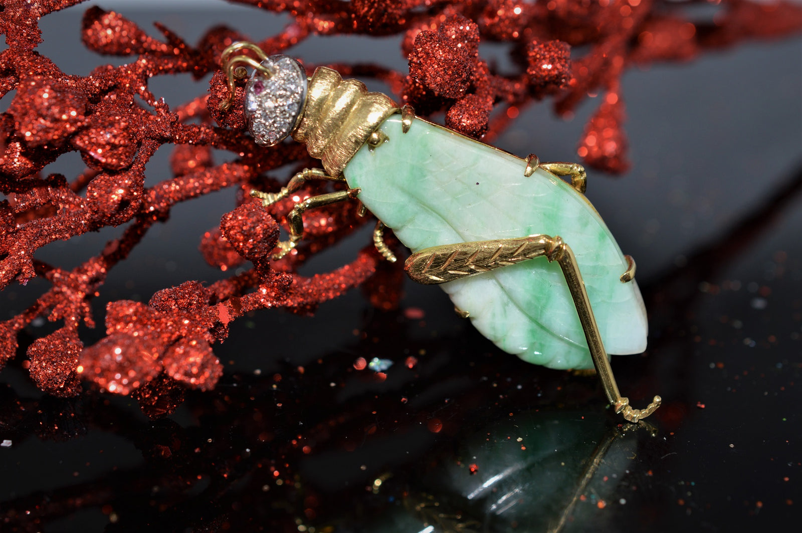 $1,550.00 USD18K Gold & Platinum Handmade Carved Jade Grasshopper Brooch