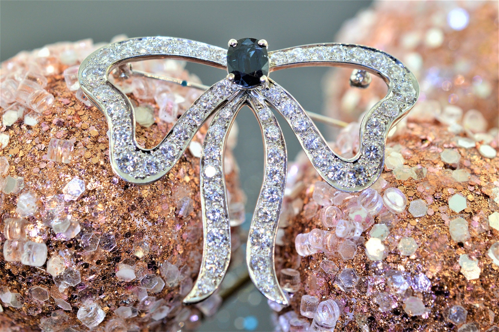 Brooch set with an 8x6 mm genuine oval sapphire and 54 round brilliant cut diamonds with a total weight of 4 carats